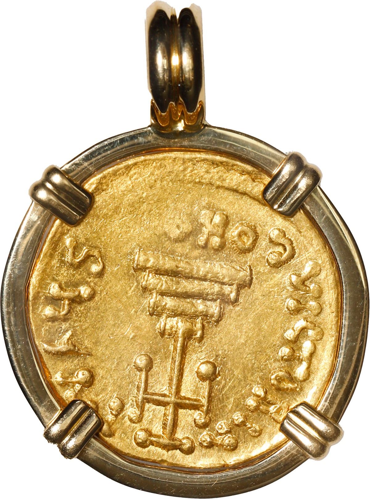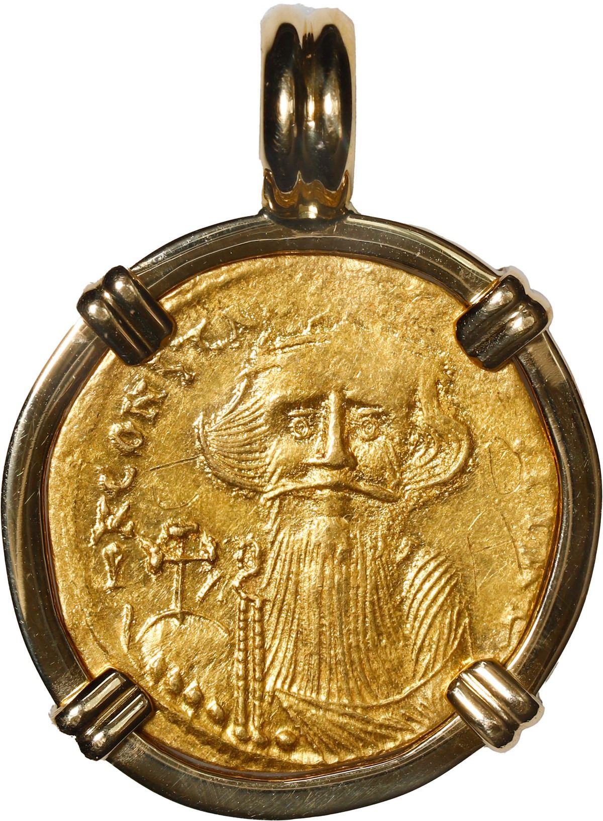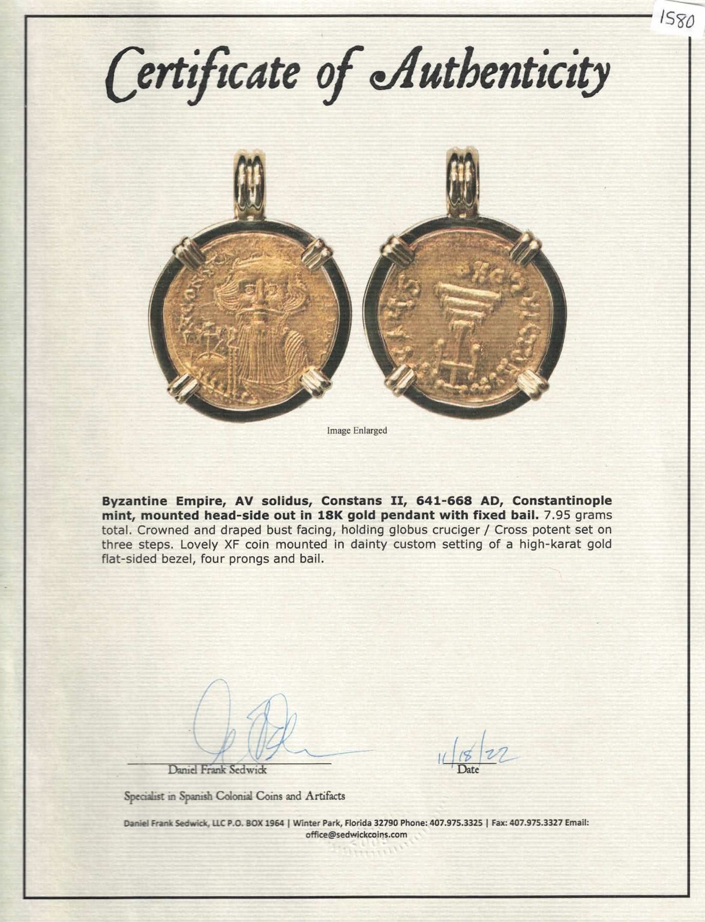 BYZANTINE EMPIRE, Constantinople mint, AV solidus, Constans II, 641-668 AD, mounted head-side out in 18K gold pendant with fixed bail. 7.95 grams total. Crowned and draped bust facing, holding globus cruciger / Cross potent set on three steps. Lovely XF coin mounted in dainty custom setting of high-karat gold flat-sided bezel, four prongs and bail. With Sedwick certificate.