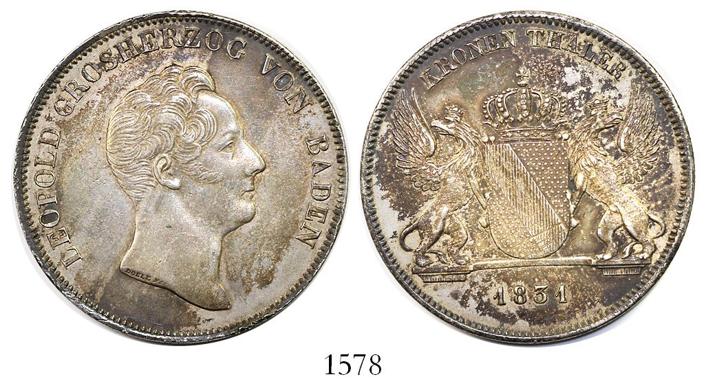 Baden, German States, 1 thaler, Leopold I, 1831. KM-195.1. 29.43 grams. Problem-free AU+ with rich but uneven toning.