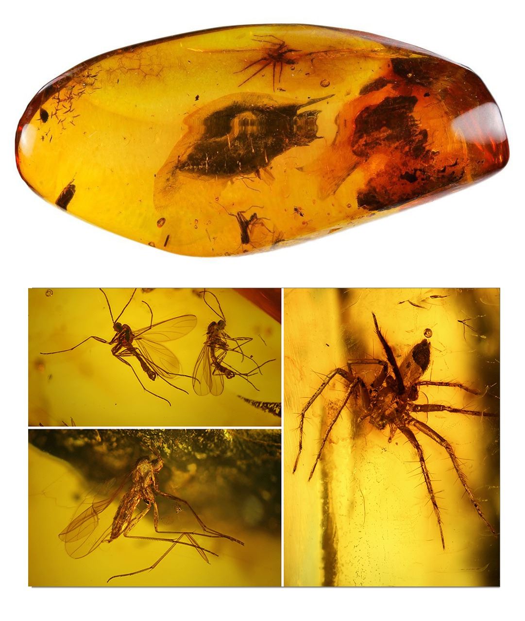 Baltic amber with preserved spider and flies, approx. 44 million years old, from Kaliningrad, Russia