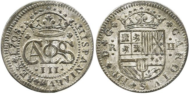 Barcelona, Spain, milled 2 reales, Charles III, 1708. KM-PT5; CT-24. 4.5 grams. XF with brassy toning, hairlines from old cleaning, parts of rims weak as struck slightly off-center.