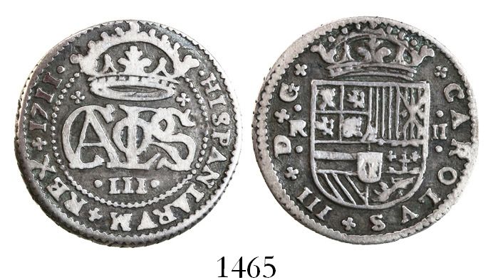 Barcelona, Spain, milled 2 reales, Charles III Pretender, 1711. CT-27; KM-PT5. 4.33 grams. Attractively toned and problem-free VF, popular issue famously overseen by Sir Isaac Newton.