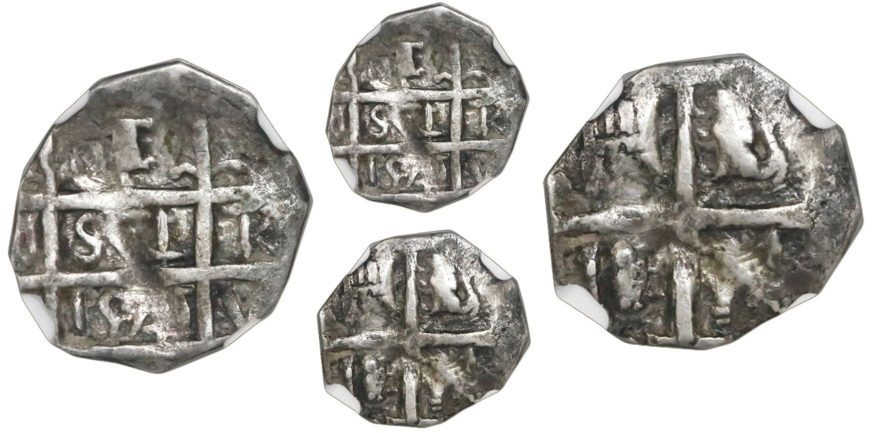 Barinas (Caujaral), Venezuela, "imitation cob" 1 real ("chipi-chipi"), "154" date (ca. 1817), NGC Fine details / tooled, ex-Rosenman (stated on label). KM-unl (C2 for type). 1.86 grams Bold full pillars and cross on typically undersized flan, slightly uneven strike, the stated tooling being some inexplicable gouges on both sides, the "date" unlisted in KM. Pedigreed to the Rosenman collection. NGC #4485897-011.