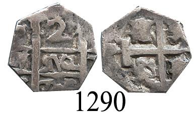 Barinas, Venezuela?, imitation cob 2 reales, (1)782? 1.8 grams. Mysterious coin whose cut and theme are accurate for the Barinas 1R issues of 1817 (with dates as "781"), but the date on this coin appears to be (1)782 or (1)787, and the denomination is quite clearly "2". Whatever it is, it has been circulated (Fine) and is nicely toned. Could be a sleeper.