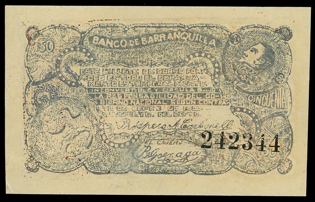 Barranquilla, Colombia, Banco de Barranquilla, 50 centavos, September 1900, serial 242344.