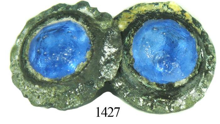 Base-metal cufflink with blue-glass stones. 1.6 grams, 3/8" diameter each. A cute little cufflink made of black (encrusted) metal (possibly pewter) with bright blue (glass) stones in round sockets, bits of shell on back next to intact loops with connector. From the Capitana El Rubí and pedigreed to Art McKee's Sunken Treasure Museum, with certificate.