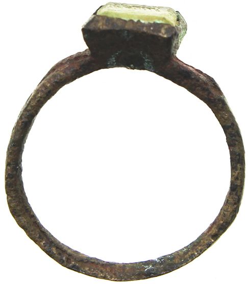 Base-metal ring (ladies') with non-precious stone, size 4. 1.2 grams. Intact but somewhat discolored and lightly encrusted wire ring with (now) colorless square stone on top, possibly restorable for wearing but neat as a genuine artifact anyway. From the "Cannon Pile wreck" site, with Sedwick certificate from 2001. Recovered from: Spanish 1715 Fleet, east coast of Florida