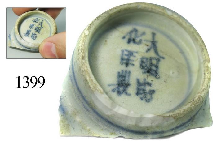 Base of a Chinese Kangxi blue-on-white porcelain cup with Chinese characters. 14.0 grams, roughly 1½" in diameter. While only the round base of a broken teacup, this piece is important in that it bears 6 Chinese characters, which typically tell when and where the porcelain was manufactured (but we cannot translate), apparently two pieces that were once separate but glued back together. From the Capitana El Rubí and pedigreed to Art McKee's Sunken Treasure Museum, with certificate.