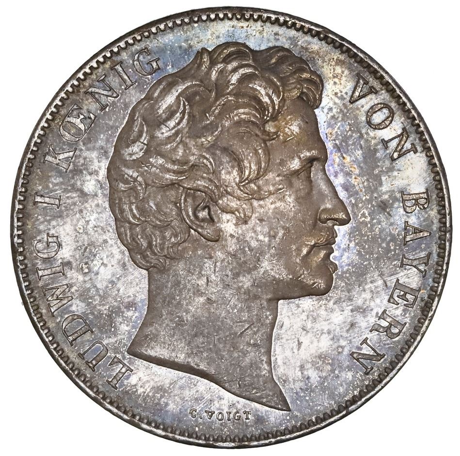 Bavaria (German States), 2 taler, 1839, Ludwig I, Maximilian I monument, NGC AU 58. Thun-77; Jaeger-68; KM-804; Dav-583. Bold strike with light cabinet friction, deep blue and purple toning over muted luster. Pedigreed to the Zeitlos Collection (stated on label) and purchased from the Gerhard Hirsch auction #16 of April 16, 1958, lot #1832, with collector's tag. NGC #5902795-013.