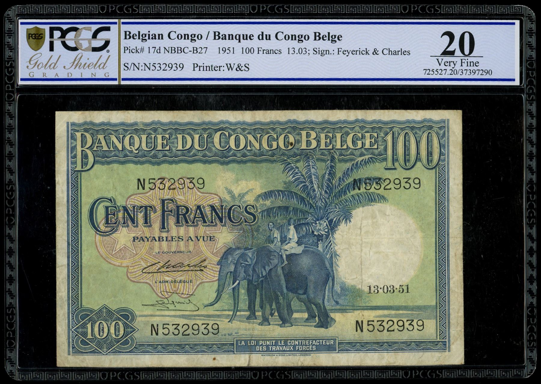 Belgian Congo, Banque du Congo Belge, 100 francs, 13-3-1951, serial N532939, PCGS VF 20, finest and only known example in the PCGS census. SCWPM-17d. Circulated yet boldly colored note printed by Waterlow and Sons with a front vignette of people riding elephants, annotation noted on the reverse.