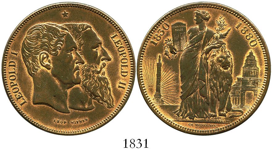 Belgium, 5 franc-sized medal in copper, Leopold II, 1880, 50th anniversary of independence.