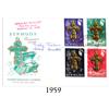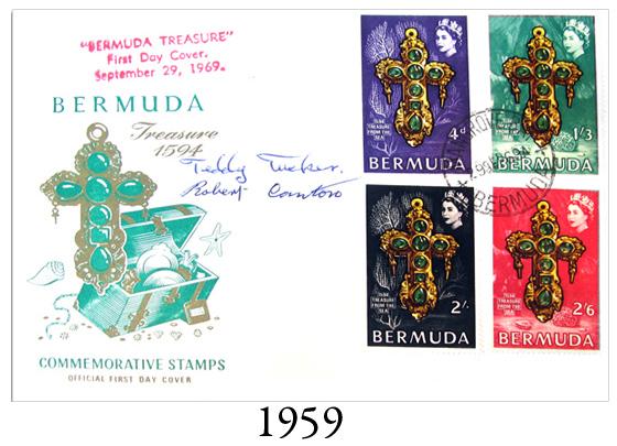 Bermuda commemorative First Day Cover (stamps) of September 29, 1969, signed by Teddy Tucker and fellow diver Robert Canton. 6-1/2" x 4-1/2". Large envelope bearing 4 large postage stamps showing the famous gold-and-emerald cross found by Teddy Tucker and Robert Canton on the wreck of the San Pedro in 1955 with the words 1594 TREASURE FROM THE SEA, the cross pictured also on the envelope itself with a treasure chest and the words BERMUDA / Treasure 1594 / COMMEMORATIVE STAMPS / OFFICIAL FIRST DAY COVER, with " 'BERMUDA TREASURE' / First Day Cover. / September 29, 1969" stamped at top in red ink and signed by Tucker and Canton, pristine condition.