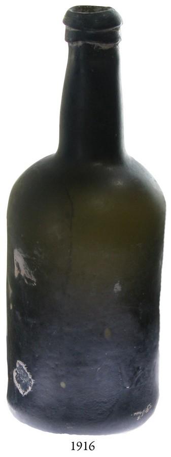 Black glass ale bottle with very deep pontil, English, early 1820s-1840s. 685 grams, 10" tall and 3-1/2" in diameter. Tall, dark-green bottle with 2" deep pontil (deepest we've ever seen on this type), matte surfaces, intact rolled lip.
