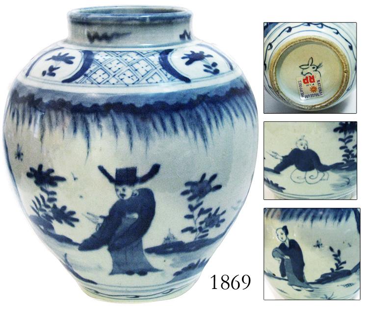 Blue-and-white Chinese porcelain jar (small), late Ming Dynasty, 4 people motif, with maker's mark rabbit on base. 1179 grams, 7-1/2" tall. Basket-weave pattern with four flowers on shoulders above scene with four very differently dressed humans, deep base, perfectly intact and with lustrous glaze, the interior showing how it was made from two joined parts. With Philippines National Museum sticker #0090087. Recovered from: Unidentified 17th-century wreck off Cotabato, Mindanao, Philippines.