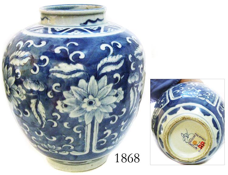 Blue-and-white Chinese porcelain jar (small), late Ming Dynasty, flowers motif (dark blue), with maker's mark rabbit on base. 1063 grams, 7-1/2" tall. Gorgeous light-blue design all over (blue fields, white flowers), perfectly intact and with lustrous glaze, the interior showing how it was made from two joined parts. With Philippines National Museum sticker #0090828. Recovered from: Unidentified 17th-century wreck off Cotabato, Mindanao, Philippines.
