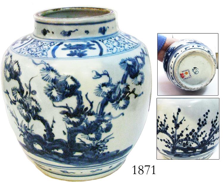 Blue-and-white Chinese porcelain jar (small), late Ming Dynasty, plants motif, with maker's mark rabbit on base. 1007 grams, 6-1/4" tall. Basket-weave pattern with four flowers on shoulders above scene with three different plants, perfectly intact and with lustrous glaze, with silvery overglaze remaining here and there. With Philippines National Museum sticker #0090957. Recovered from: Unidentified 17th-century wreck off Cotabato, Mindanao, Philippines.