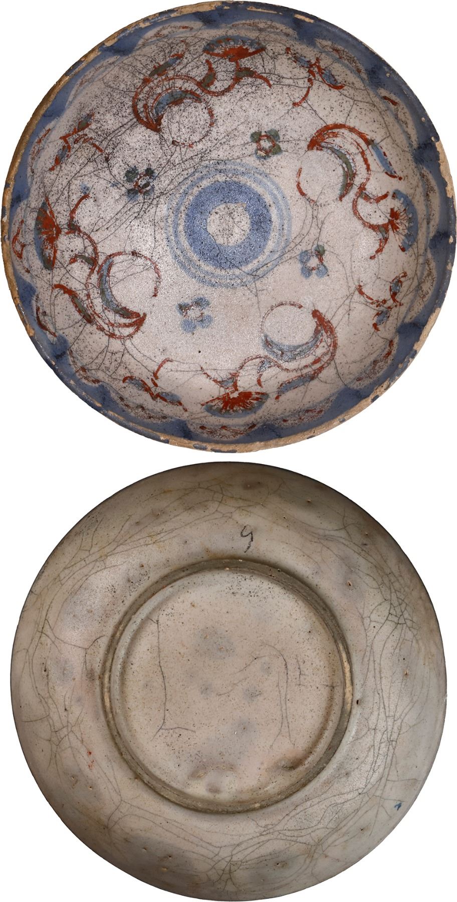 Blue-, white-, and red-glazed Delftware saucer, intact, ex-pirate ship Golden Fleece (1686).