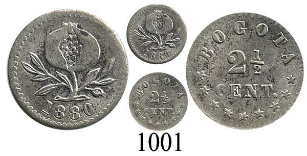 Bogotá, Colombia, 2½ centavos, 1880. KM-169. 0.7 gram. Lustrous AU+ with deceptively weak obverse.