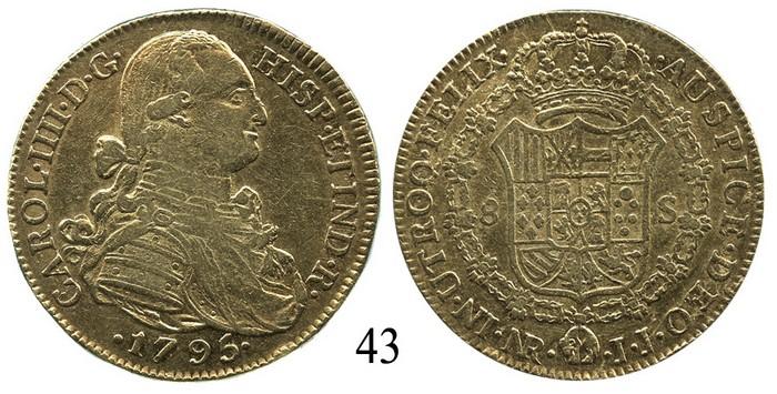 Bogotá, Colombia, bust 8 escudos, Charles IV, 1795JJ. KM-62.1. 26.8 grams. Highly lustrous XF+, no problems.