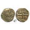 Bogotá, Colombia, cob 2 escudos, Charles II, assayer not visible, cut down to weight of a 1E. KM-14.1. 3.3 grams. Very odd little coin with details of pre-1700 Charles II (nearly full cross, most of shield) but with the periphery evidently chopped away in the just right amount to make this a 1E, also with some scratches near the edge, VF with toning on fields.
