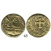 Bogotá, Colombia, cob 4 escudos, 1740M, rare, encapsulated PCGS AU-50. S-B26, KM-23, CT-254. Thick and compact round flan with choice full shield, small bold cross, bold 174 and certain 0 of date, closer to Mint State in our opinion, with attractively contrasting sediment on fields. Pedigreed to our Treasure Auction #3, lot #25.