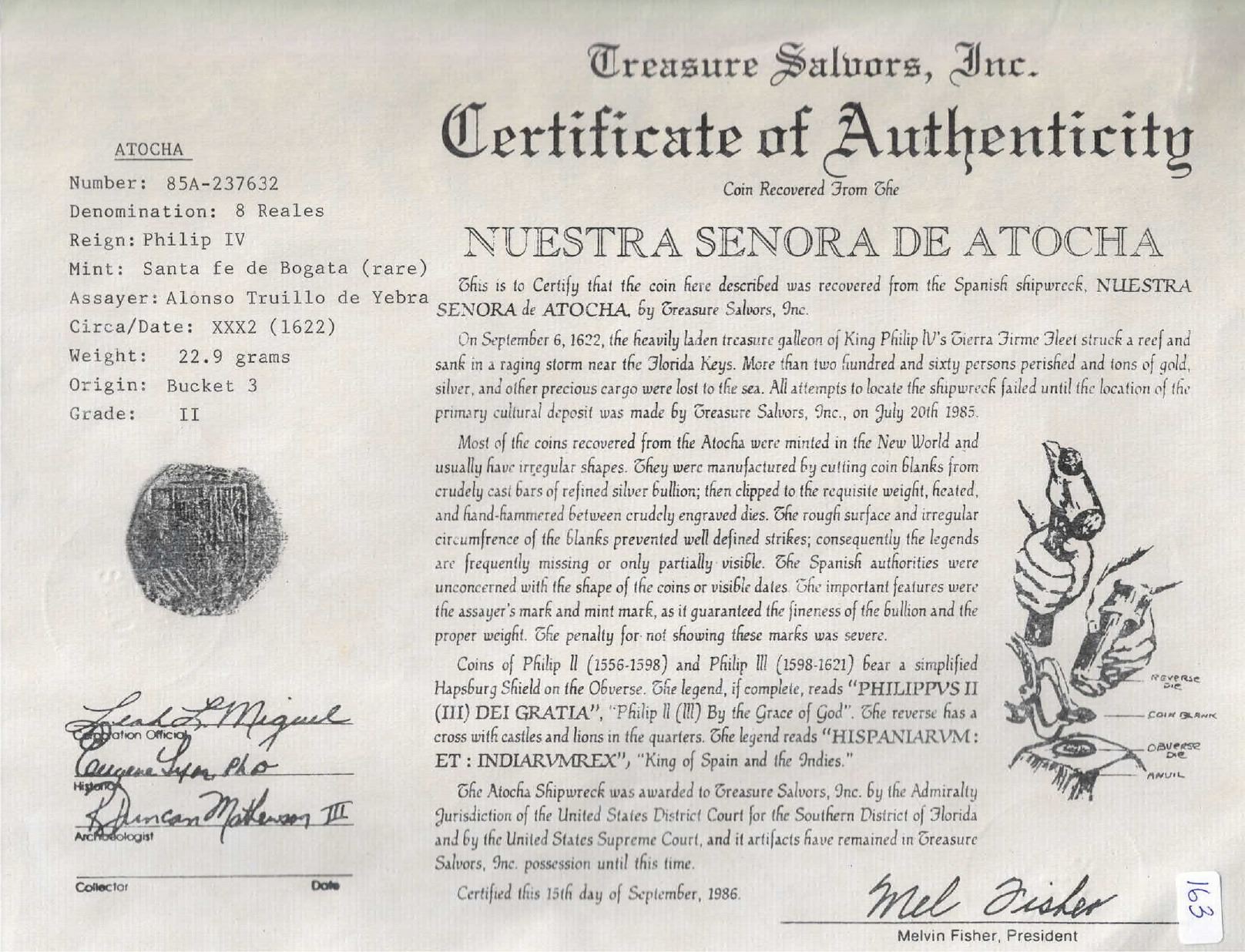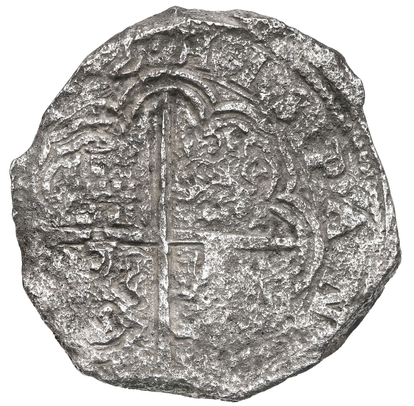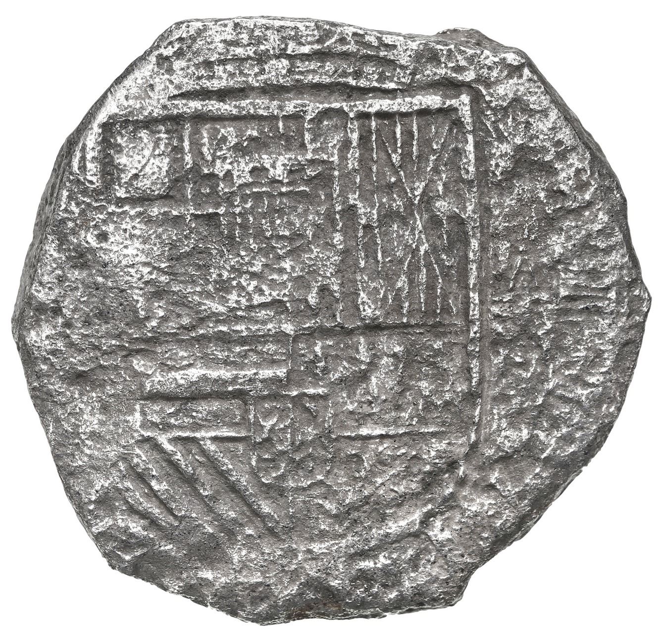 Bogotá, Colombia, cob 8 reales, 1622 A, Grade 2, rare. Restrepo-M42.1; S-B1; KM-3.2; Cal-1533. 22.94 grams. Hefty coin despite moderate surface corrosion, the well-detailed shield and cross-lions-castles full but both more or less off-center to the extent that the final 2 of the date and the assayer A to right are fully visible (mintmark RN to left is off the flan), rare first issue of Bogota. With Fisher tag and certificate 85A-237632. From: Atocha, sunk in 1622 west of Key West, Florida