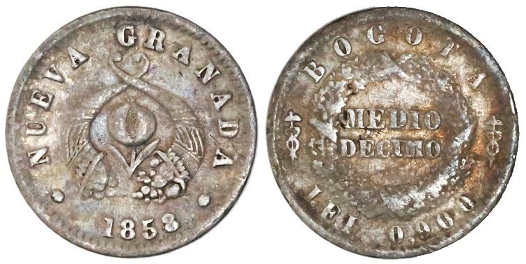 Bogota, Colombia, 1/2 decimo, 1858/4, NGC XF 40.