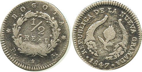 Bogota, Colombia, 1/2 real, 1847RS.
