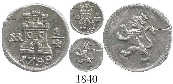 Bogota, Colombia, 1/4 real, 1799. R-75.8; KM-63; CT-1433. 0.8 gram. Lustrous, rainbow-toned UNC with hairline edge-split (as made), choice grade.