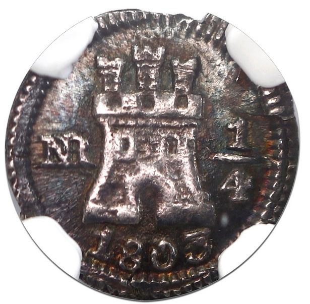 Bogota, Colombia, 1/4 real, 1803/2, NGC AU 58, finest known in NGC census.