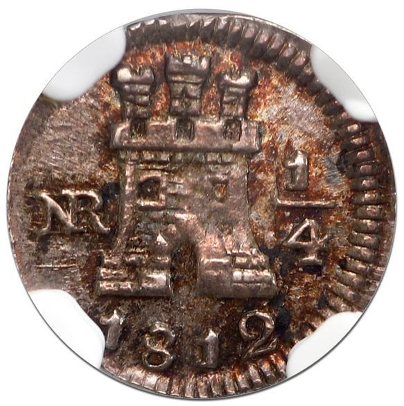 Bogota, Colombia, 1/4 real, 1812, NGC MS 63, finest known in NGC census.