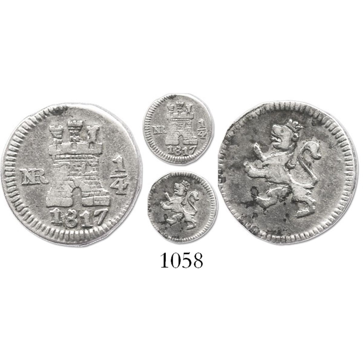 Bogota, Colombia, 1/4 real, 1817. R-100.17; KM-67.1. 0.8 gram. Lightly toned AXF, struck slightly off-center, better date.