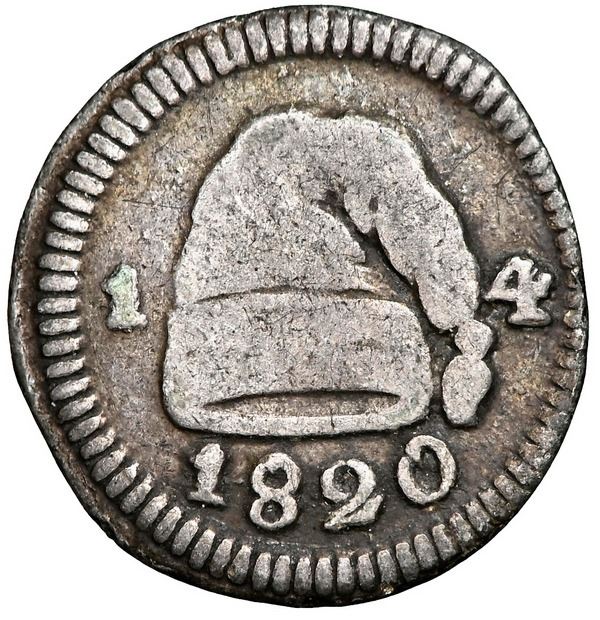 Bogota, Colombia, 1/4 real, 1820, rare, NGC VF 30, ex-Bernal. Restrepo-145.1; KM-79.1. Nicely toned, evenly circulated and problem-free, a decent example of this scarce first date of the Republic type struck in the old Nueva Granada design with Phrygian cap splitting denomination 1-4 and no mintmark. Pedigreed to the Bernal Collection (stated on label).