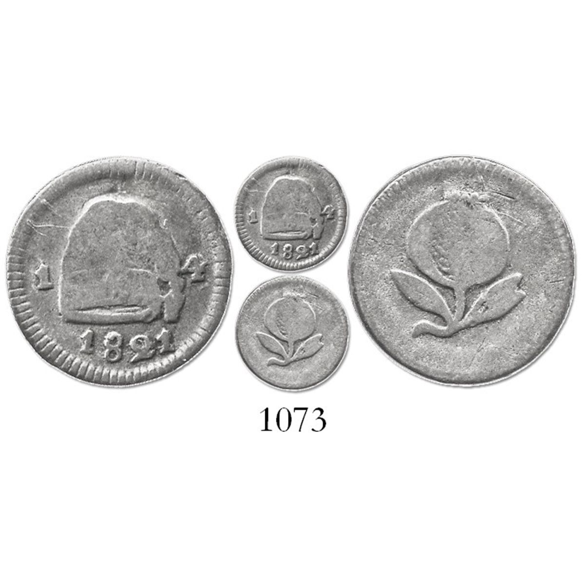 Bogota, Colombia, 1/4 real, 1821, without Ba. R-145.2; KM-79.1. 0.7 gram. AVF for type, nicely toned and problem-free, much scarcer variety without mintmark.