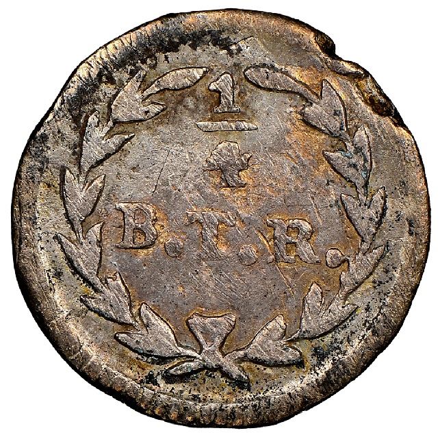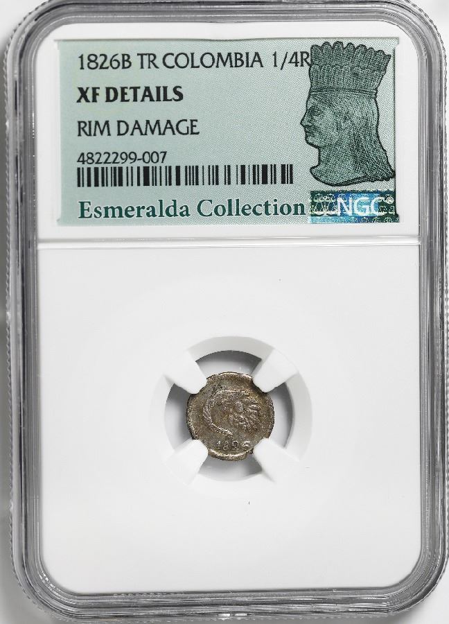 Bogota, Colombia, 1/4 real, 1826, B.T.R., rare, NGC XF details / rim damage. Restrepo-148.1; KM-85.1. Fairly bold strike, with light rainbow toning all over, scratches on raised rims, interesting one-year one-denomination issue with mintmark as B to left of assayers' initials T and R (for Truxillo and Rodriguez), apparently their only joint contribution to minting in Colombia. NGC #4822299-007. Pedigreed to the Esmeralda Collection (stated on special label).