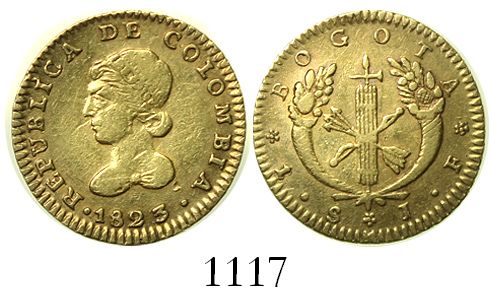 Bogota, Colombia, 1 escudo, 1823JF. Restrepo-161.1; KM-81.1. 3.34 grams. Bold VF with hint of toning around details, no problems.