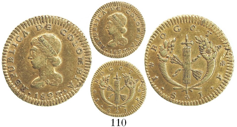 Bogota, Colombia, 1 escudo, 1823JF. Restrepo-161.1; KM-81.1. 3.40 grams. Rose-toned XF with small marks on bust and rims but otherwise nice.