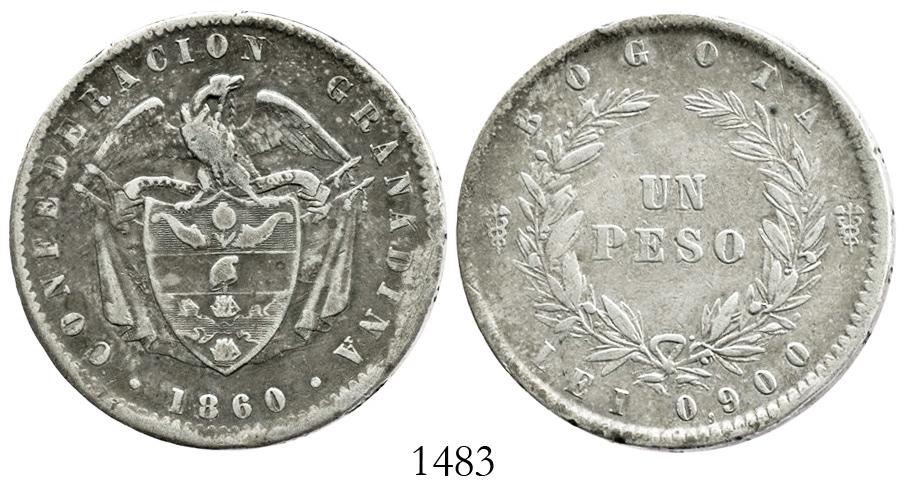 Bogota, Colombia, 1 peso, 1860. Restrepo-226.4; KM-126. 24.7 grams. VF or so with deeply rainbow-toned obverse, slightly crude rims.