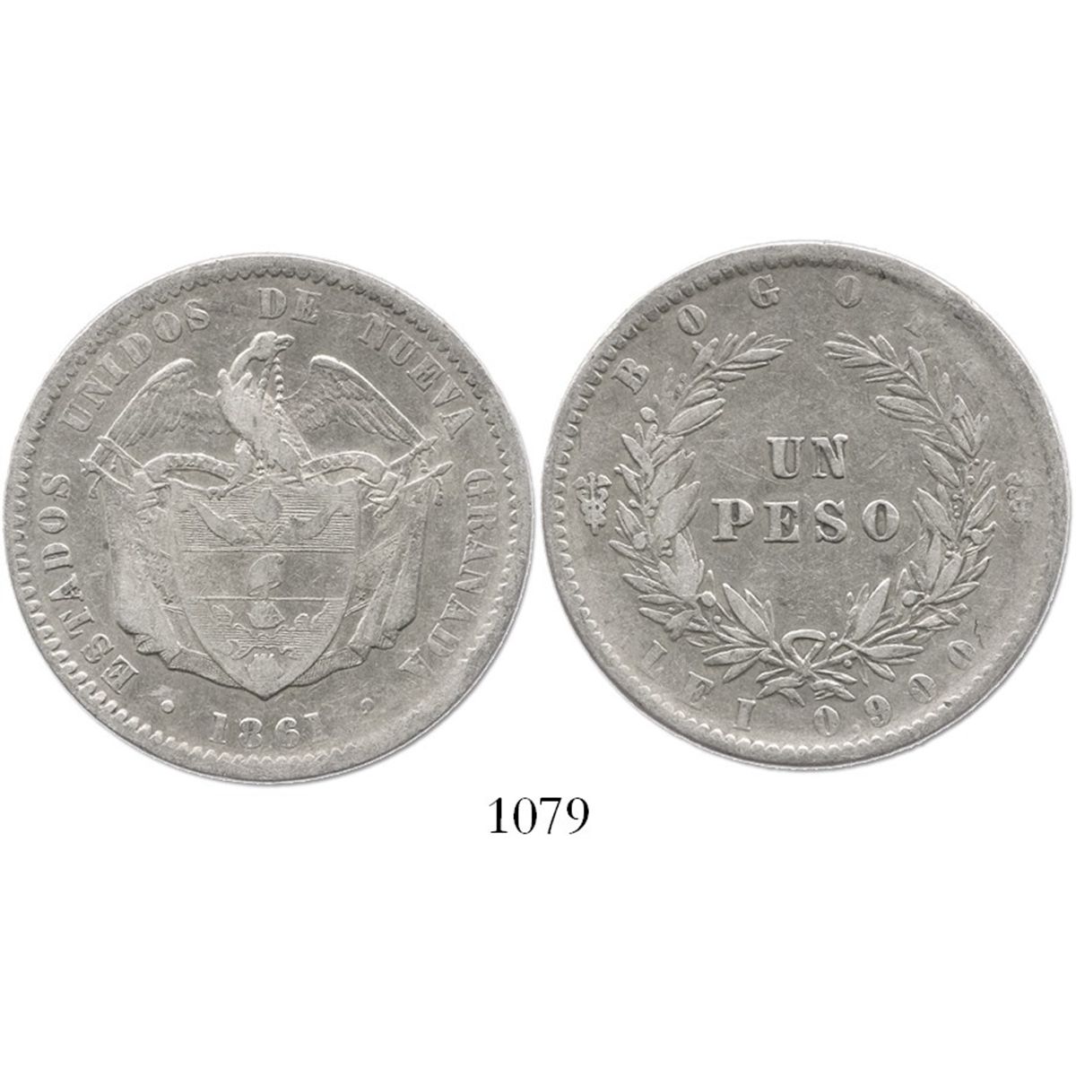 Bogota, Colombia, 1 peso, 1861. R-243.1; KM-138. 25.1 grams. Problem-free VF, parts of rim weak (as made), overpriced in KM due to error in government listing.
