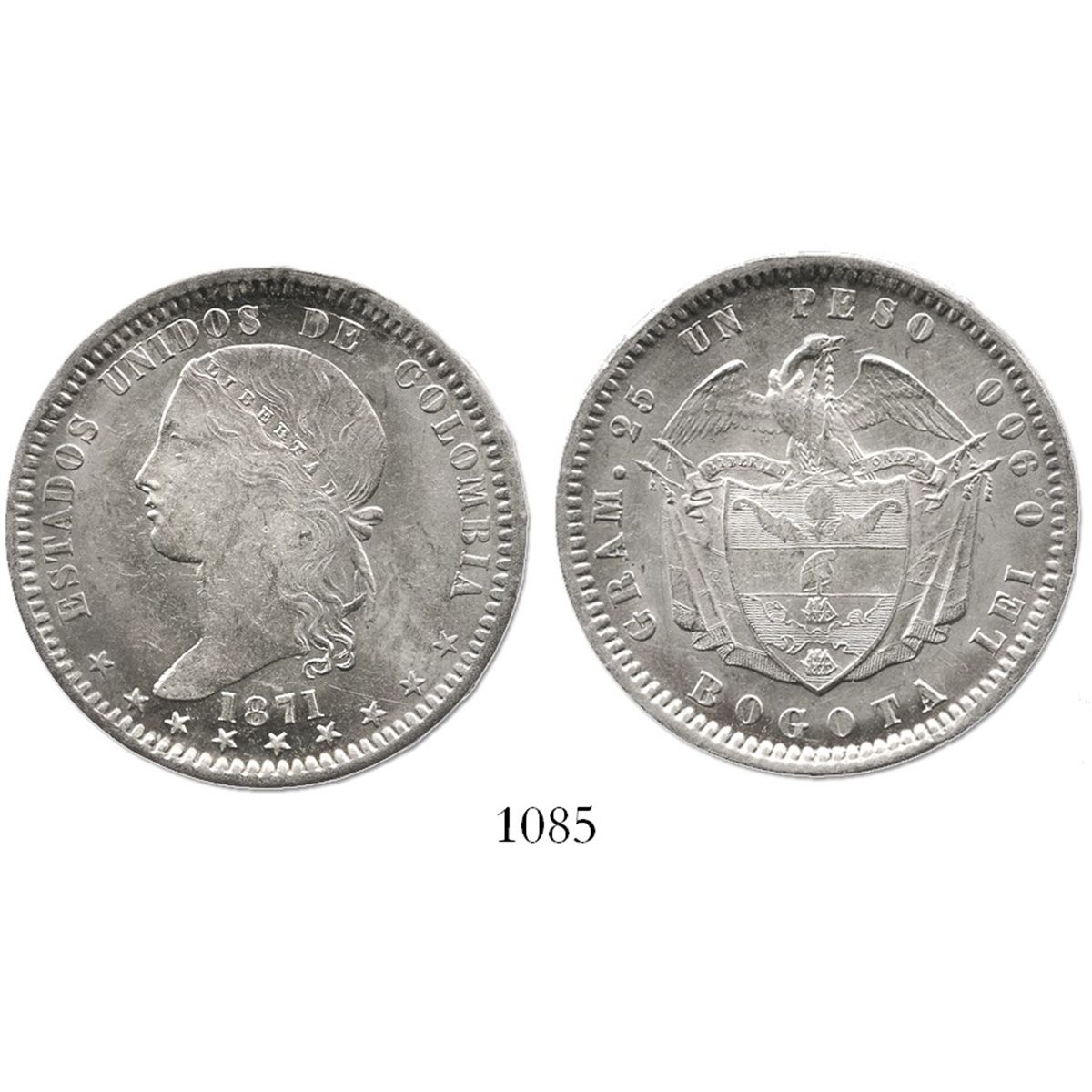 Bogota, Colombia, 1 peso, 1871. R-317.2; KM-154.1. 24.8 grams. Problem-free BU, highly lustrous, nearly perfect except for minor bagmarks in fields.