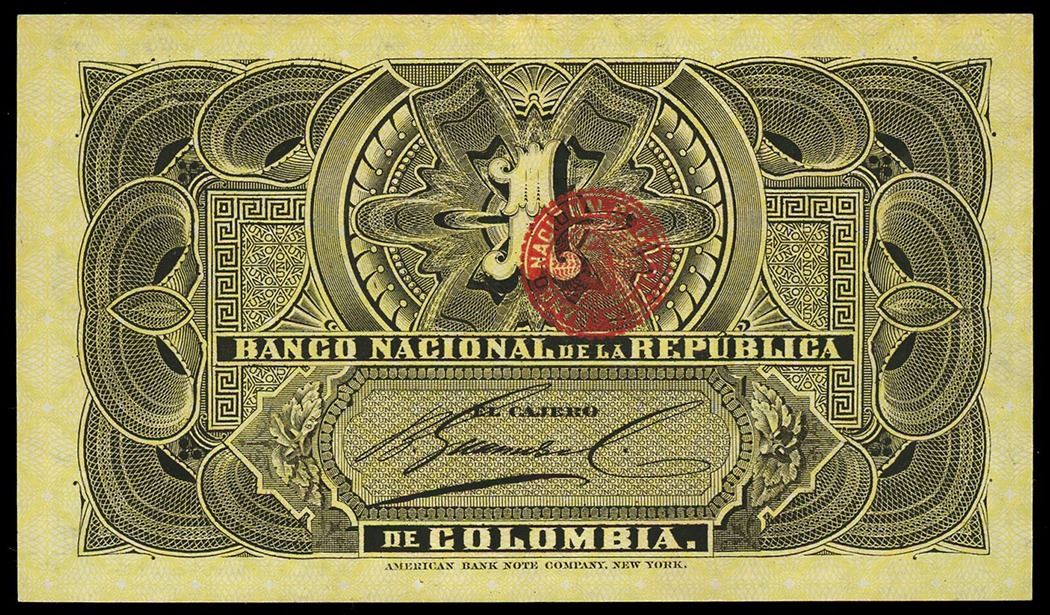 Bogota, Colombia, 1 peso oro, 5-3-1895, series B, serial 548657. SCWPM-234; CHPM-186. UNC with nice centering, vivid ink colors.