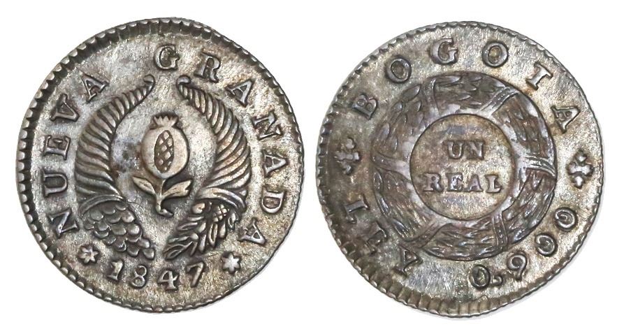 Bogota, Colombia, 1 real, 1847, six-pointed stars, NGC AU 55.