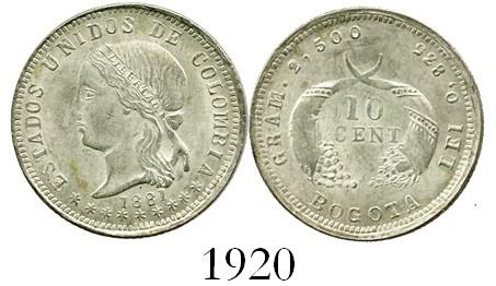 Bogota, Colombia, 10 centavos, 1881. R-274.1; KM-175.1. 2.4 grams. Frosty AU-UNC. Pedigreed to the Herman Blanton collection.