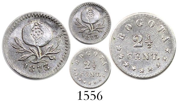 Bogota, Colombia, 2-1/2 centavos, 1873. Restrepo-249.2; KM-169. 0.62 gram. Lustrous Mint State with parts of rims weak (as made), die-crack to right of pomegranate.