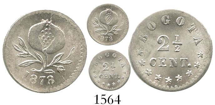 Bogota, Colombia, 2-1/2 centavos, 1878. Restrepo-249.7; KM-169. 0.6 gram. Mint State with muted luster, crude rims (as made).
