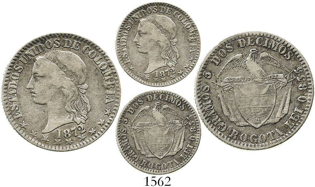 Bogota, Colombia, 2 decimos, 1872, ex-Dana Roberts, with ANACS tag VF 25, rare 1-year type. Restrepo-281.1; KM-155.1. 5.3 grams. Lightly toned, a few minor marks but very nice overall, and very similar to one that sold in our Auction #10 for over $1000. Pedigreed to the Dana Roberts collection.