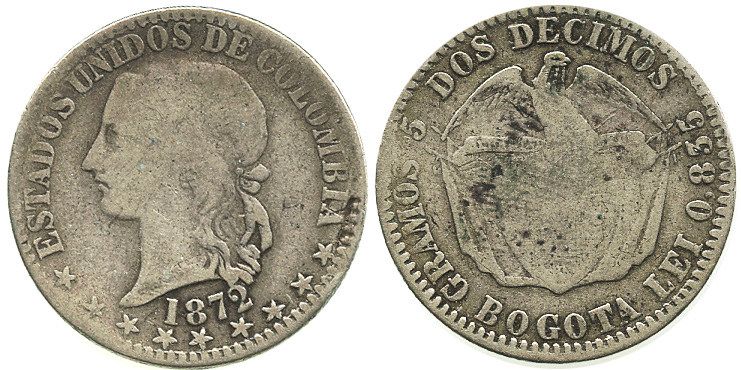 Bogota, Colombia, 2 decimos, 1872, rare. Restrepo-281.1; KM-155.1. 5.0 grams. Decent Fine with light toning, no problems, one-year type.