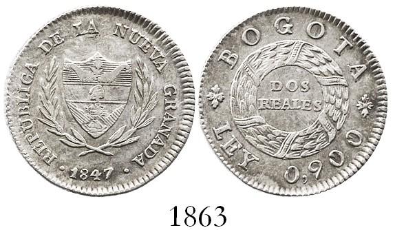 Bogota, Colombia, 2 reales, 1847. R-190.1; KM-105. 5.0 grams. Choice XF with hint of luster and toning, part of edge weak (as made). Pedigreed to the Herman Blanton collection.