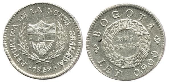 Bogota, Colombia, 2 reales, 1849. Restrepo-190.5; KM-105. 5.0 grams. Three-year type, lustrous AU with slightly crude rims (as made), no problems.