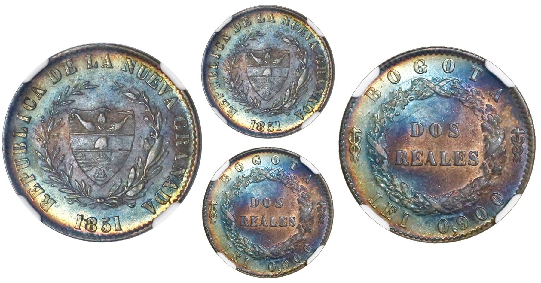Bogota, Colombia, 2 reales, 1851, NGC MS 62*, finest known in NGC census. Restrepo-191.3; KM-109. Incredible peacock toning all over, with vivid hues in every color of the rainbow, but also very choice in grade with no marks or wear but slight weakness at very highest points, numerically tied with one other in NGC census but this with "*" designation for superior eye appeal. Pedigreed to our Auction #21, with original lot-tag #1341. NGC #2713829-003.