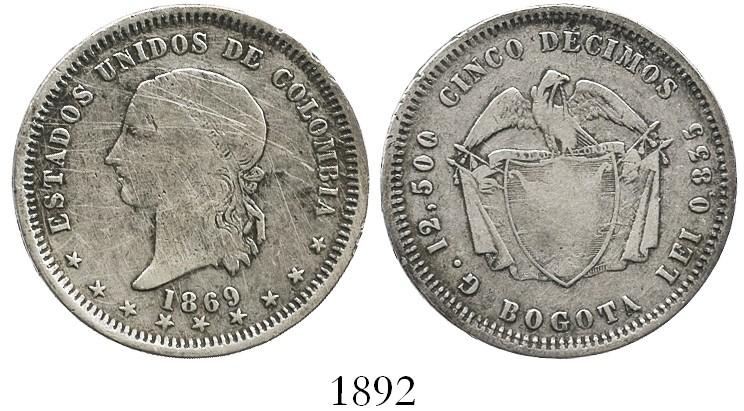 Bogota, Colombia, 5 décimos, 1869. R-293.2; KM-153.1. 12.2 grams. AVF with abundant surface hairlines from cleaning, nicely contrasting toning around details. Pedigreed to the Herman Blanton collection.